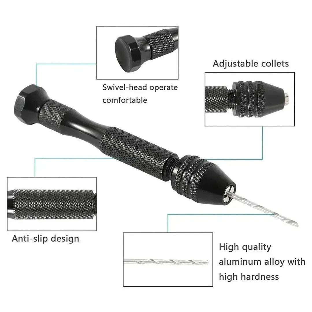 Nagtatampok ang hand drill ng isang adjustable drill holder na tumanggap ng iba't ibang laki ng drill, na tinitiyak ang perpektong akma para sa iyong mga partikular na pangangailangan. Tamang-tama para sa mga modelo, alahas, kuwintas, plastik, wire, at iba pang proyekto ng DIY na nangangailangan ng tumpak na pagbutas ng butas.